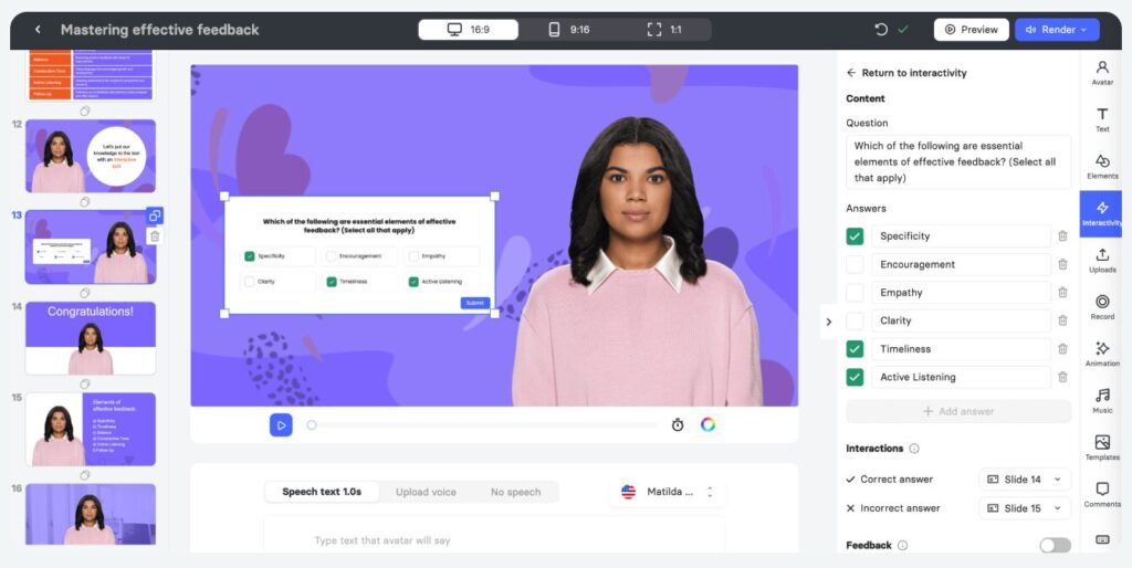 Once you’ve generated an AI avatar, you can use it to present scripts as if you were recording a video yourself. Some tools add an interactive element, allowing your avatar to communicate with and respond to a user.