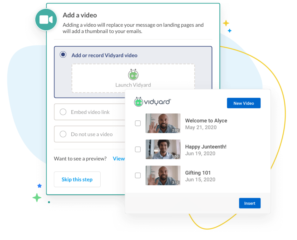 Add personalized Vidyard videos directly into your personal gift message to prospects with Vidyard's Alyce integration. Add an extra personal touch to your corporate gifting strategy to boost gift acceptance and response rates.